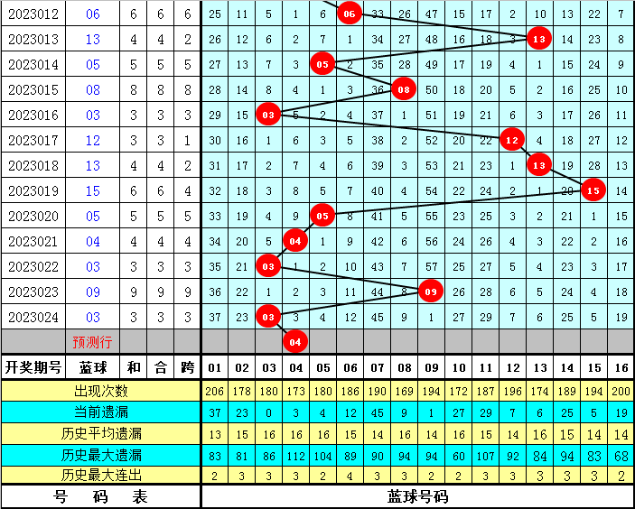 蓝球号码分析:上期蓝球奖号开出03,为质数号码,最近30期蓝球号码质合比为13:17,最近9期蓝球号码质合比为5:4,本期蓝球存眷合数号码,独蓝参考04。